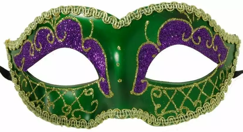 They’ll be green with envy when you walk into the party wearing this lovely mask! The mask is detailed in green, with purple and gold glitter, and gold trim.