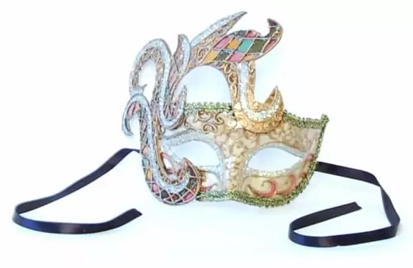This beautiful, detailed paper mache mask features beige, gold, and pink colors and ribbon ties and will surely stand out at costume parties!