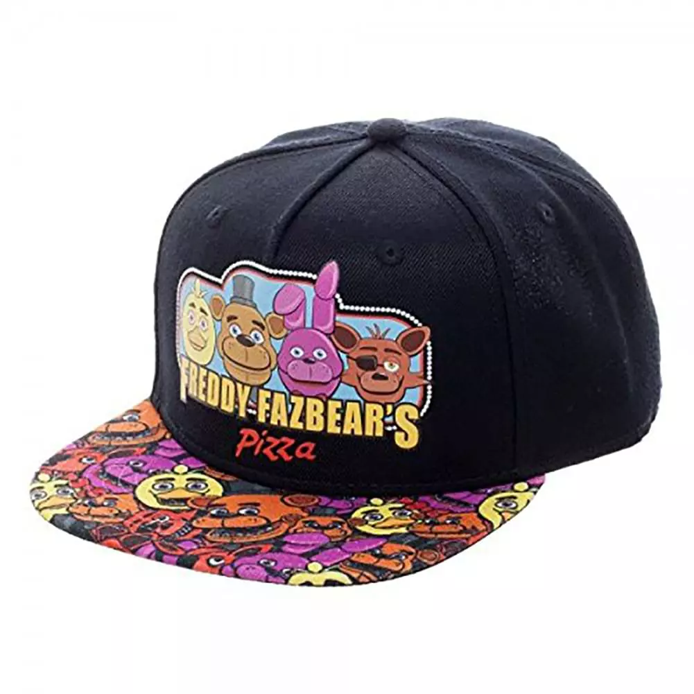 Wear your love of Five Nights at Freddy’s with this stylish snapback cap! Made of 68% Acrylic, 10% Polyester, 10% Wool, 10% Cotton, this black hat features Freddy and the gang on the front, and the colorful cast decorates the brim. Adjustable hat is one size fits most. Youth sized. Officially licensed.