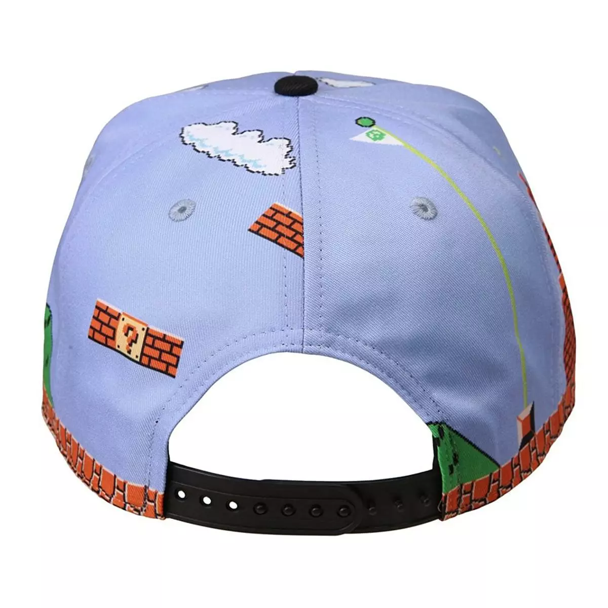 Relive the days when the Mario Brothers moved on a scrolling 2-D platform with this nostalgic 8-bit snapback! This cap features an allover print of the Super Mario Bros. tubed landscape with a black hat brim. Adjustable sizing, one size fits most. The perfect gift for any retro game fan!