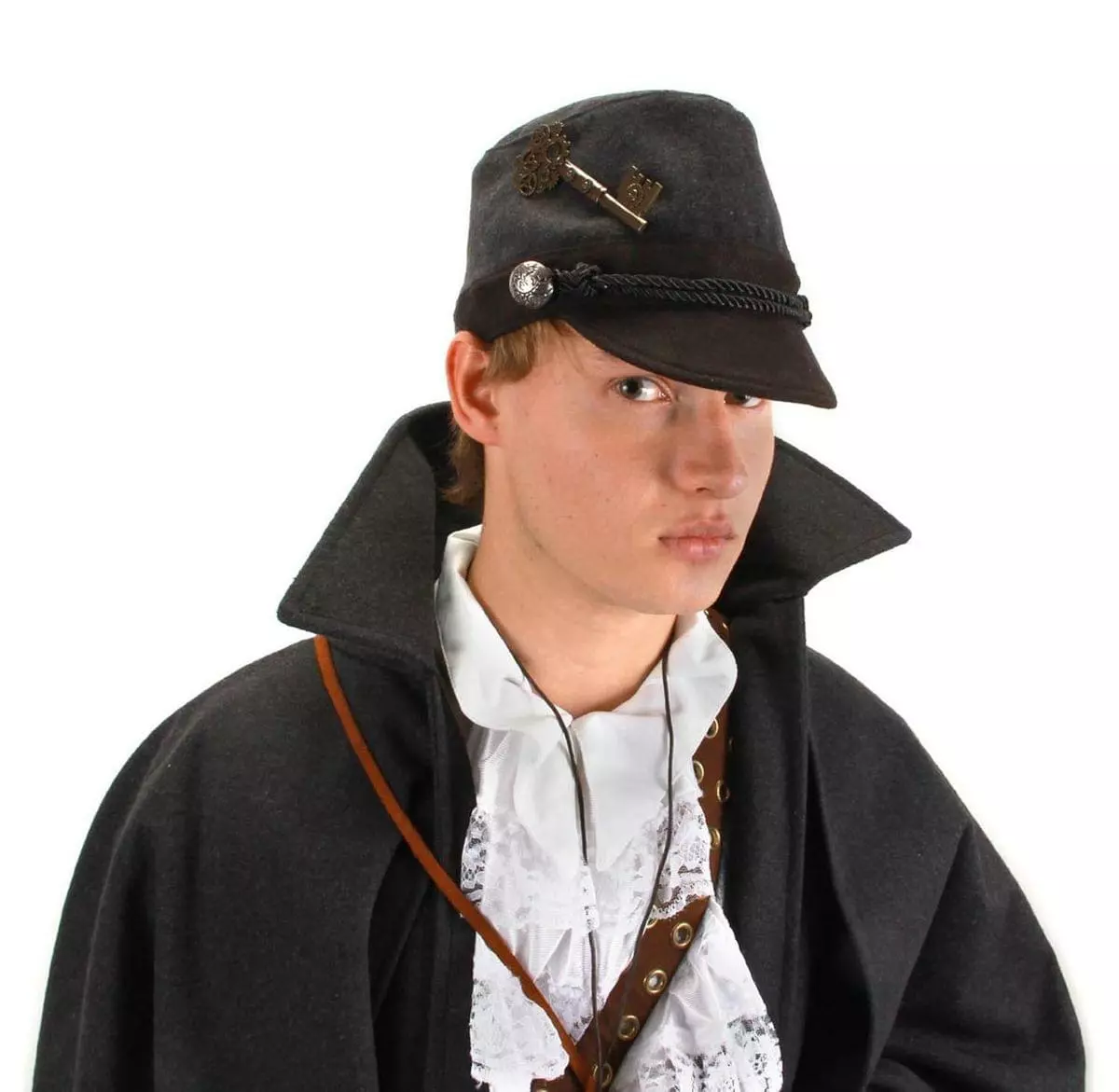 Your the ideal work of Steampunk fiction in the Steampunk Grey Cadet Costume Hat.
