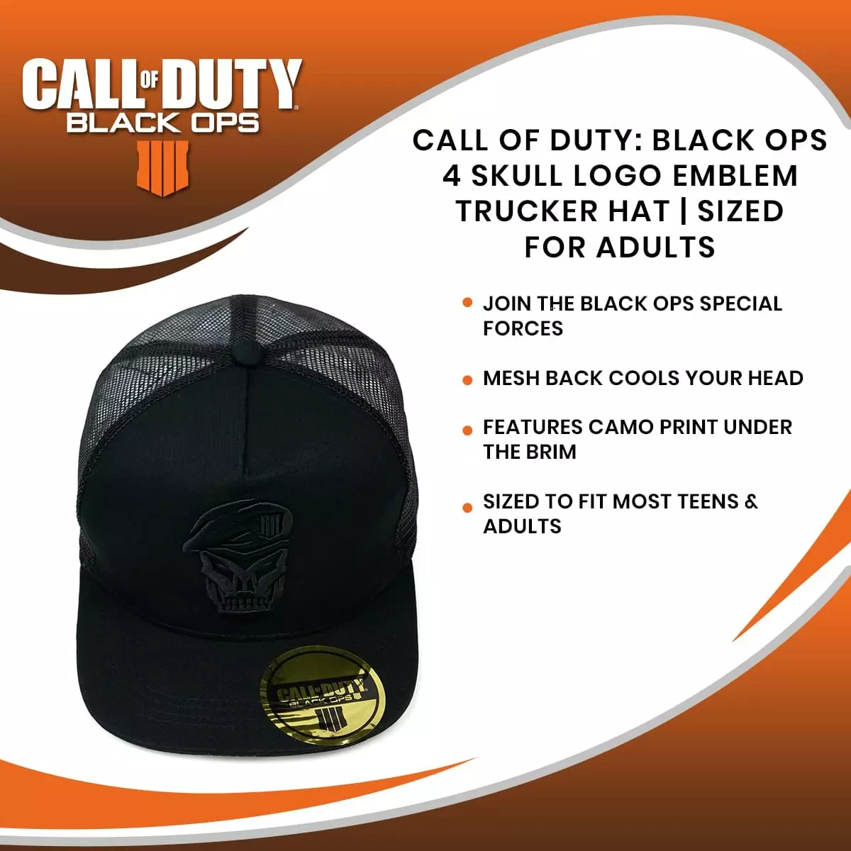 Featuring the skull and beret logo from the Call of Duty: Black Ops 4 video game, this mesh back trucker hat is ideal for gamers and fans of the exciting shooter series. With a snapback design, this Call of Duty cap is sized to fit most adults and teens. The cool mesh back provides comfortable airflow to ensure that your head does not get too hot, an ideal feature for frustrating multiplayer matches! This hat also makes a great gift for any gamer in your life!