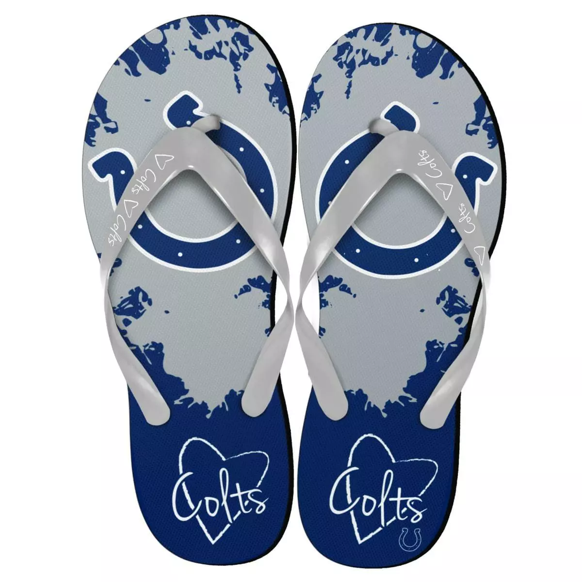 Show your love for the Indianapolic Colts with a splash of team colors! Wear the fun-looking Indianapolis Colts NFL Womens Paint Splatter Flip Flops to the game, beach or any day.
