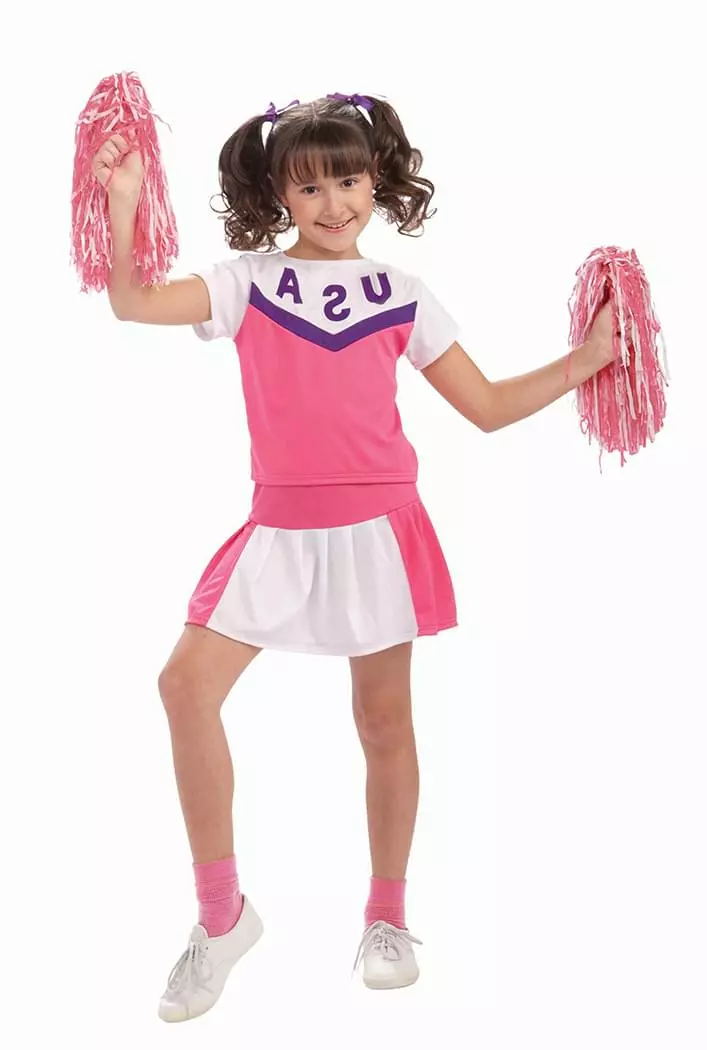 Cheer on team USA in this pretty pink cheerleader uniform! This comfortable pink, white, and purple costume features a top with the letters “USA” printed on the chest as well as a matching skirt!