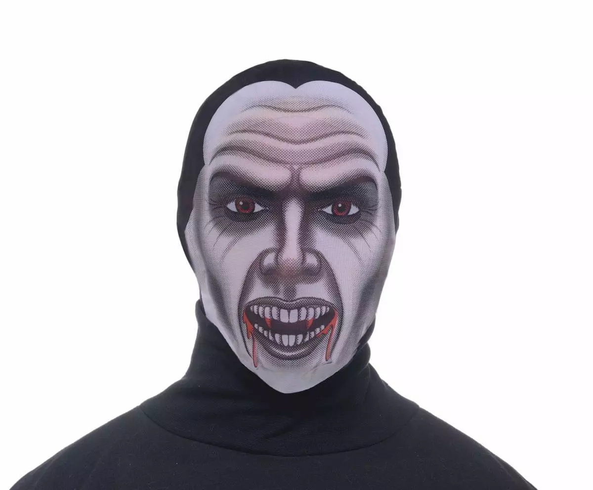From the Disappearing Man collection, our adult Vampire Hooded Mask includes a full overhead sock-style mask made of a stretchy polyester-spandex. It is black with a white printed face at the front featuring red eyes, fangs, dripping blood around the mouth and widow’s peak. Its lightweight, breathable and snug fit also gives you the ability to see and breathe without its removal. It is an innovative, inexpensive and simple way to create a masked character. Our Fabric Vampire Mask is an ideal for your scary vampire Halloween costume.