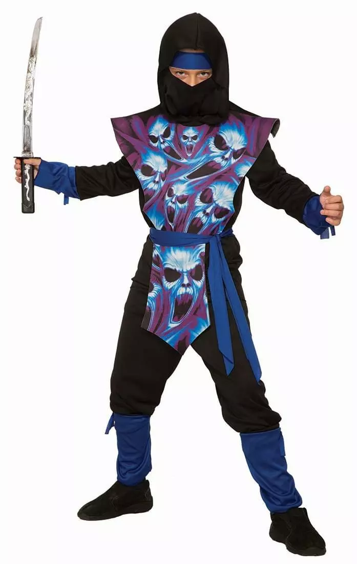 Your child will have fun this Halloween dressed up as a Ghost Ninja! 100% polyester costume includes a hooded shirt, face mask, tabard with ghostly skull print, pants and belt. Sword NOT included, sold separately. Made by Forum Novelties, a leader in costumes and novelty products for more than 30 years.