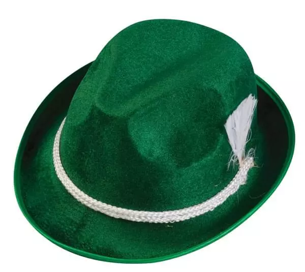 Dress for the German brew-haha in a Green Oktoberfest Hat with dapper Bavarian styling a white braided rope hatband and a white feather accent & a definite magnet! Includes hat only. One size fits most adults. Works with a variety of costume looks. Brand new.