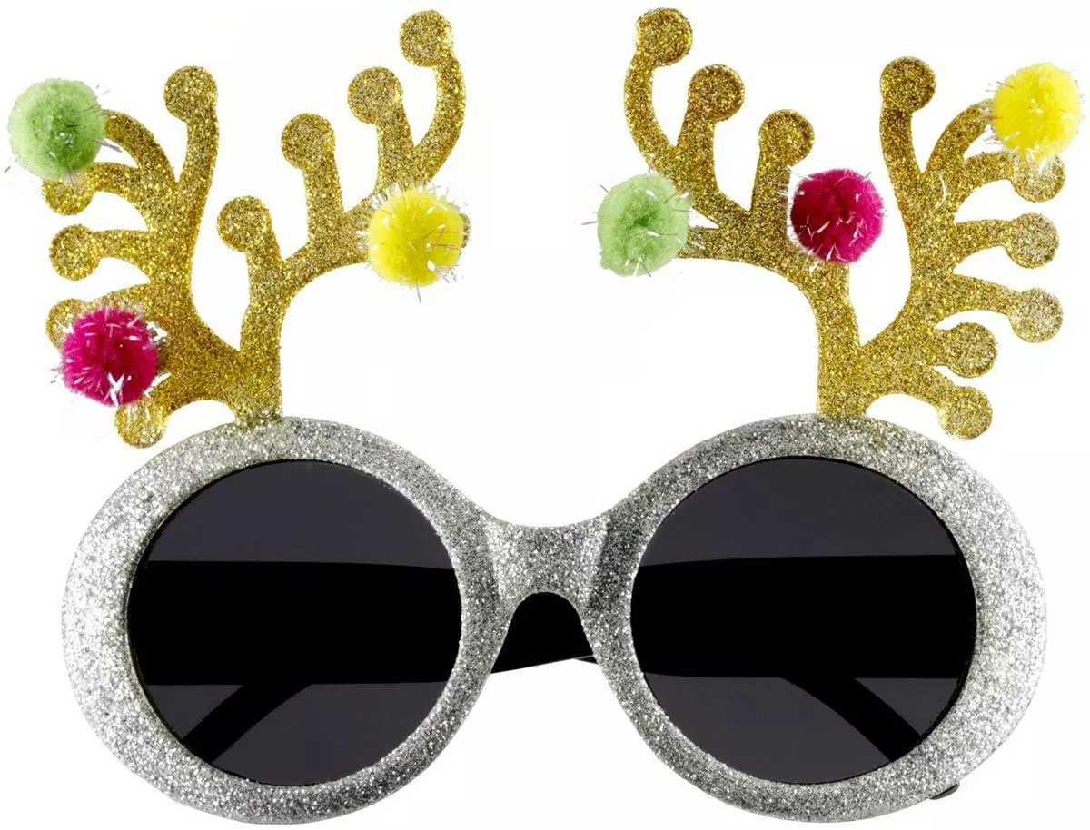 Perfect for a tree-trimming party or to wear with Christmas costumes at school or when out caroling with the neighbors. Whatever your plans are this Christmas, these shades make fun stocking stuffers and are perfect for Ugly Sweater Parties! These glasses feature glittery silver frames with attached glitter antlers and puff balls!