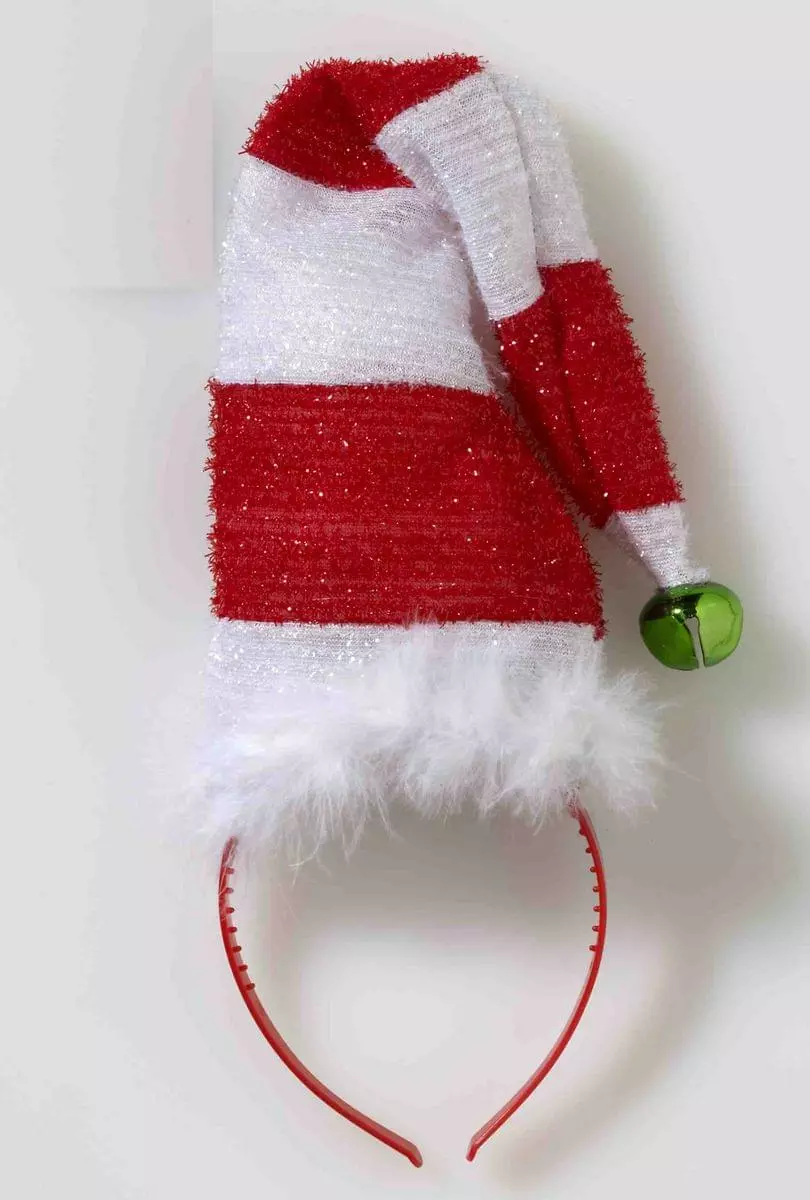 Who wants to hear jingle bells? The Striped Santa Hat with Bell Costume Headband looks great with many Christmas costumes or just wear it to spread some holiday cheer. This headband is a one size fits most adults and makes a great holiday stocking stuffer. White and red striped hat features a green bell. Ideal for elf costumes to complete your festive look.