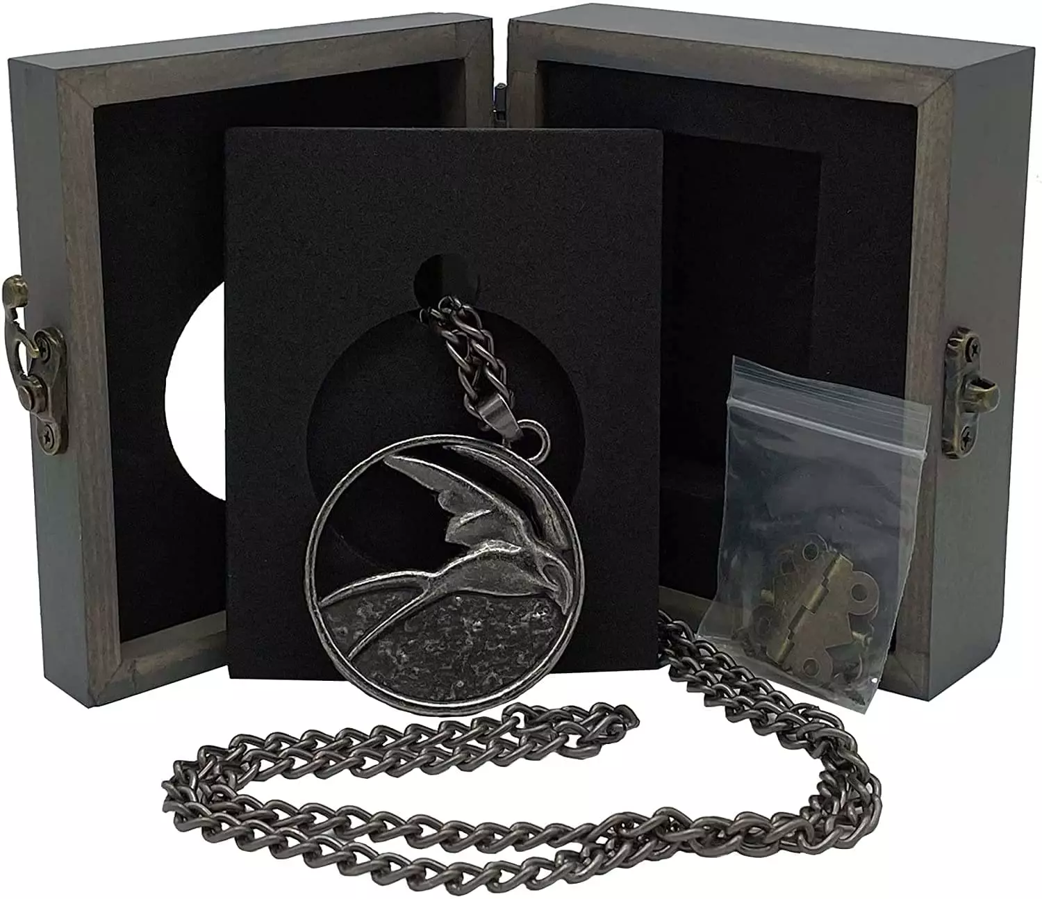 Ciri’s medallion necklace is ideal for any fan of the princess of Cintra. The intricate details and high quality have been inspected and approved by the best craftsmen in the Northern Kingdoms. Molded flat relief design; medallion constructed from zinc alloy, chain is iron. Medallion measures approximately 2 inches in diameter; chain is 30 inches. Packaged in wooden collector’s case, measures 3.75 x 4.5 x 1 inches. Ages 15 and up.