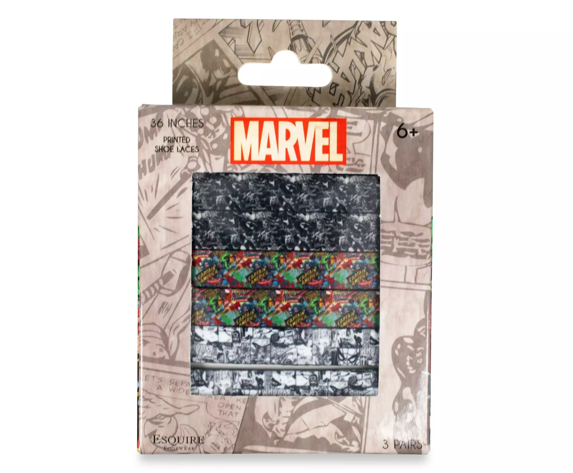 Lace up with the Marvel superheroes! This set includes 3 pairs of printed shoelaces featuring cool Marvel comic superhero designs. Laces measure 36 inches long.