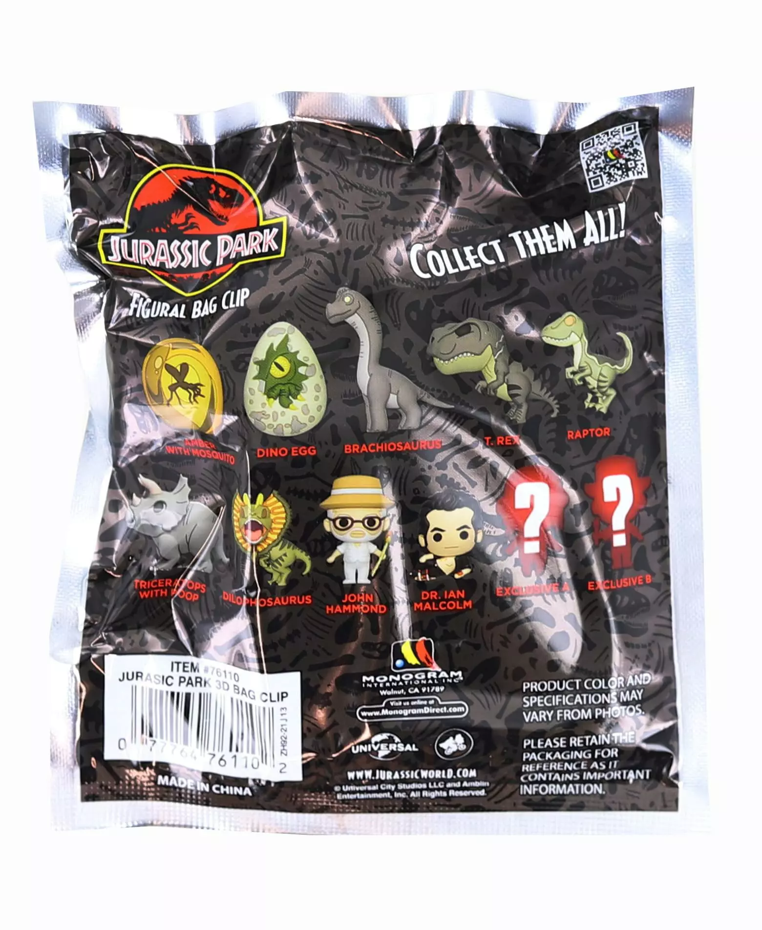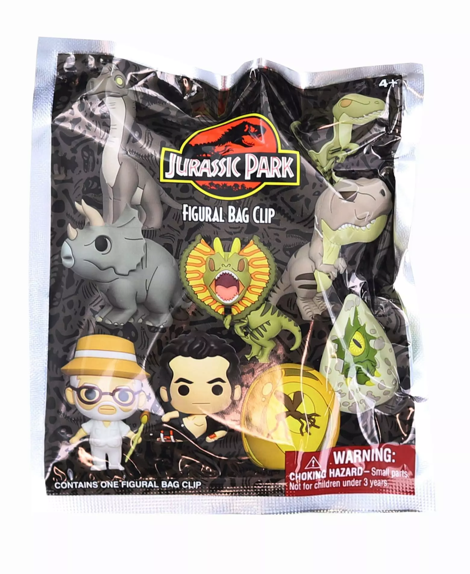 All your favorite characters from the adventurous film series, Jurassic Park are here for you to collect in 3D foam! Keep an eye out for the special rare chase figures! Each figure measures approximately 2-inches tall. Collect all your favorites like Mosquito In Amber, Dino Egg, Brachiosaurus, T-Rex, Raptor, Triceratops With Poop, John Hammond, Dr. Ian Malcolm, and more! Which one will you get? Collect them all! Officially licensed. Includes one random bag clip.