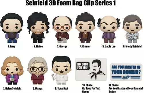 Monogram presents a blind bagged series of 3D Foam Figural Bag Clips based on the hit sitcom Seinfeld! This fun series includes Jerry, Elaine, George, Kramer, Uncle Lee, Morty Seinfeld, Helen Seinfeld, Manya, and your favorite soup server Yev Kassem! Plus, keep your eyes peeled for two different rare chase figures! Each character has a sturdy clip attachment so you can take them with you wherever you go! Each blind bag includes one figural bag clip. Figure selection is random. Which one will you get? Collect them all!