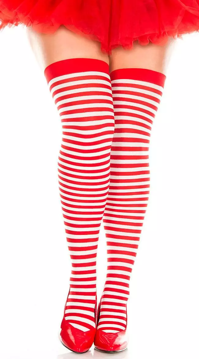 This Halloween, add some whimsy to your costume with these Striped Thigh Highs. Both fun and functional, the red-and-white pattern of these stockings will give any of your ensembles a fun pop of color. The one-size styling is made to fit most adults, featuring a comfortable fit and top-quality design.