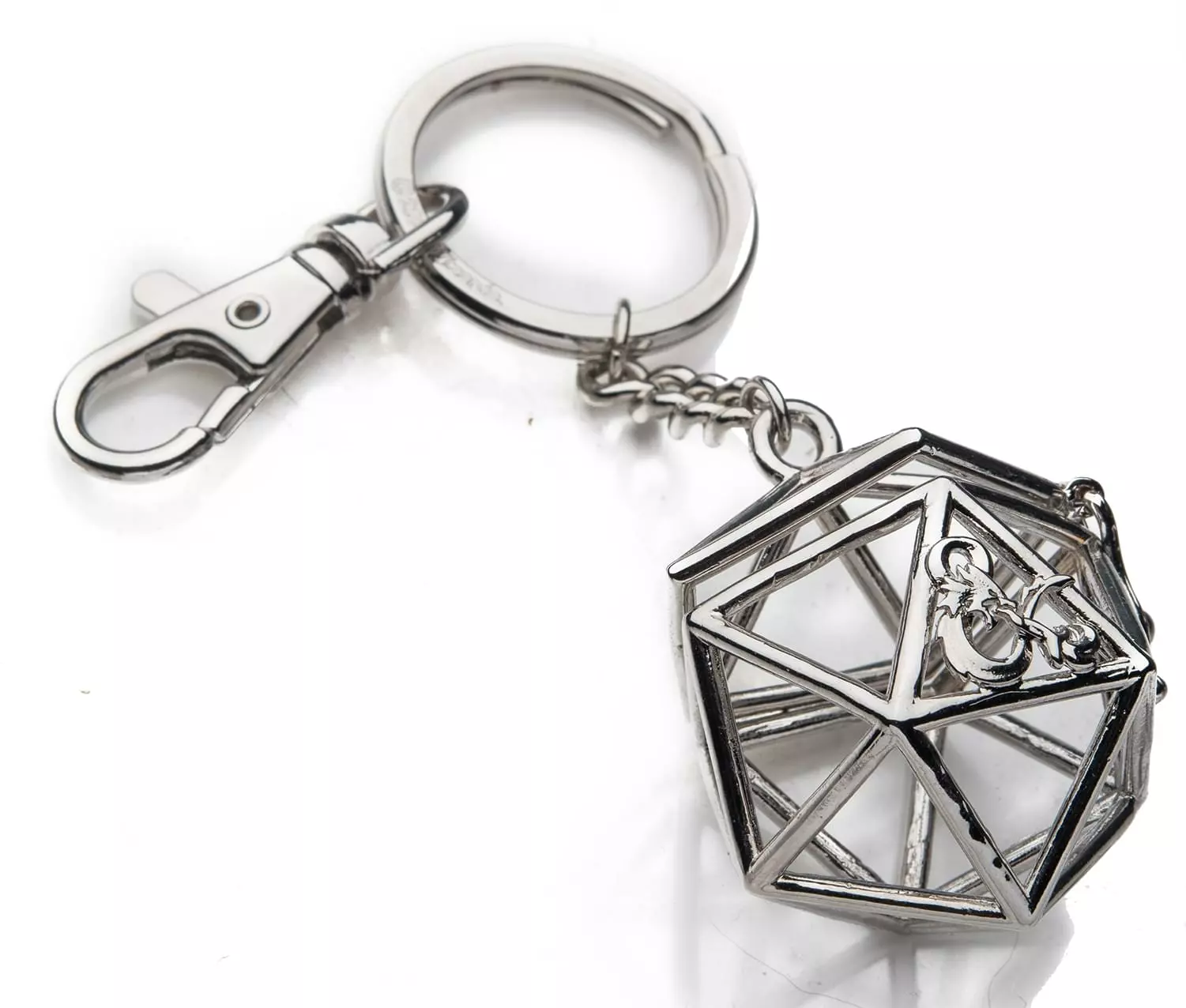 Show off your Dungeons & Dragons fandom with this fun and functional D&D Magnetic Cage Dice Holder Keychain! Made of Stainless Steel, the cage features a magnetic clasp for storing one of your favorite 20-sided die (dice not included). A handy lobster claw clasp allows you to safely carry your lucky die with you to the next campaign. Officially licensed.