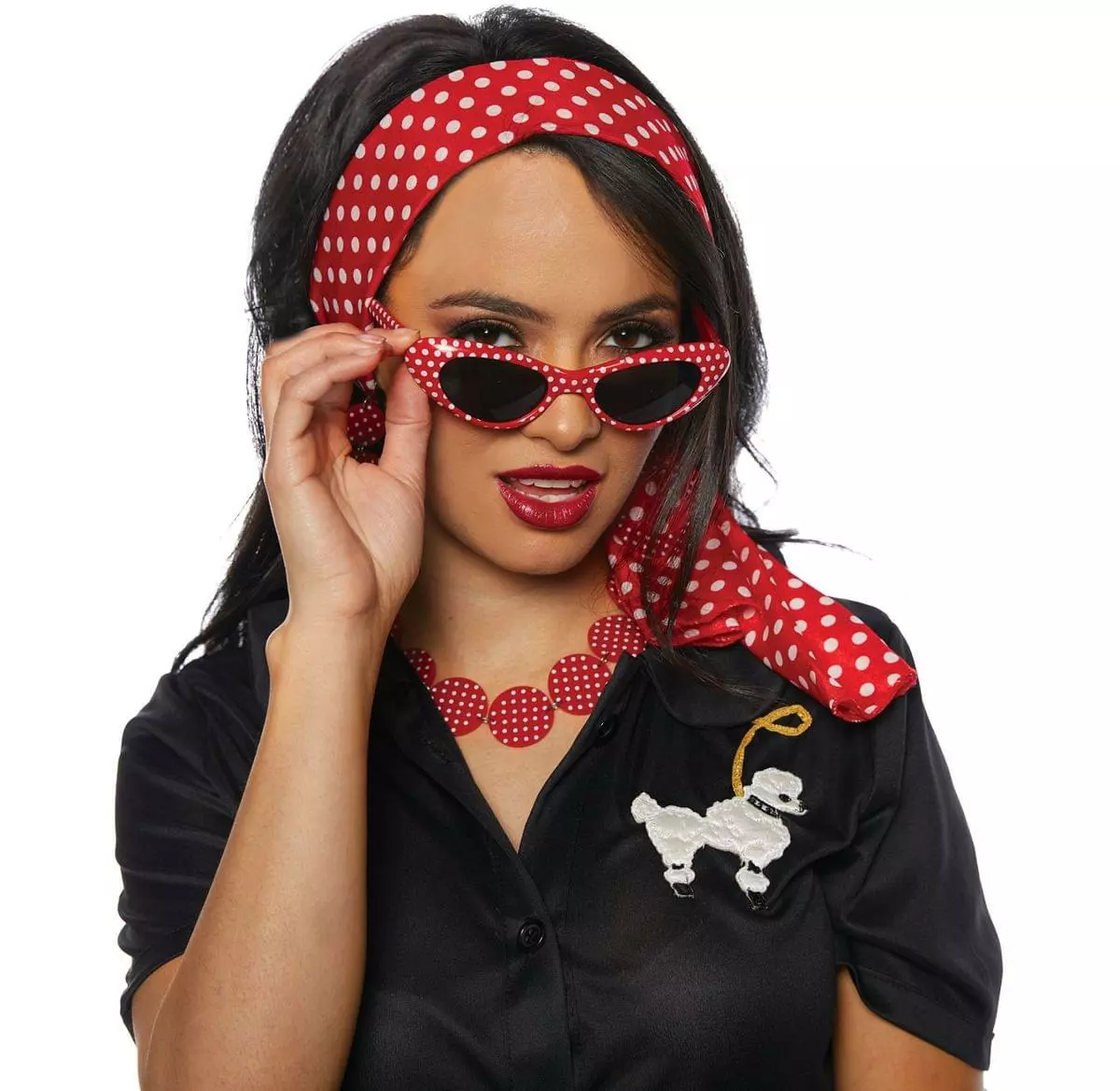 Here’s the bee’s knees, this 1950’s costume accessory kit is coolsville! This costume costume accessory kit will complete your 1950’s look in style! The set features a red head scarf, sunglasses, and one pair of earrings. It works with a variety of costume looks and themes. Ideal for costume parties, Halloween, plays, parades or wear for every day fun! This women’s accessory set is offered in one size fits most adults.